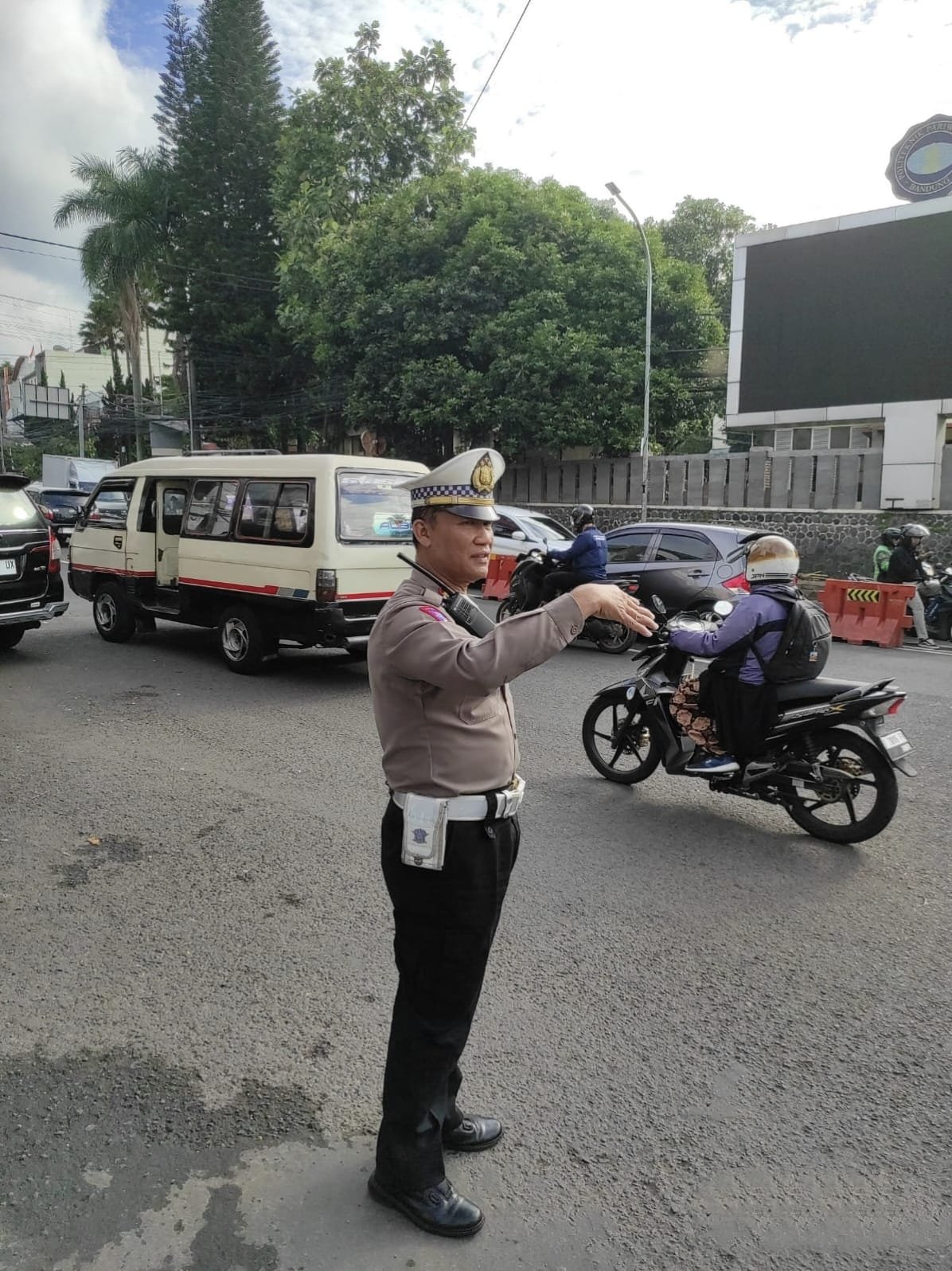 Antisipasi kemacetan pagi hari, personil lalulintas Polsek Sukasari melaksanakan pengamanan jalur di titik rawan kemacetan Wilayah Hukum Polsek Sukasari Polrestabes Bandung.(2/10/2025)