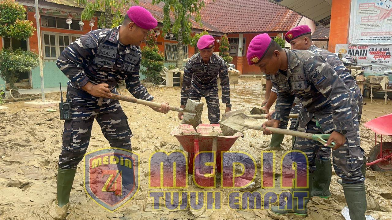 DI ACEH TAMIANG, PRAJURIT MARINIR BERSIHKAN LUMPUR DI SEKOLAH, RSUD, DAN LAPANGAN OLAHRAGA