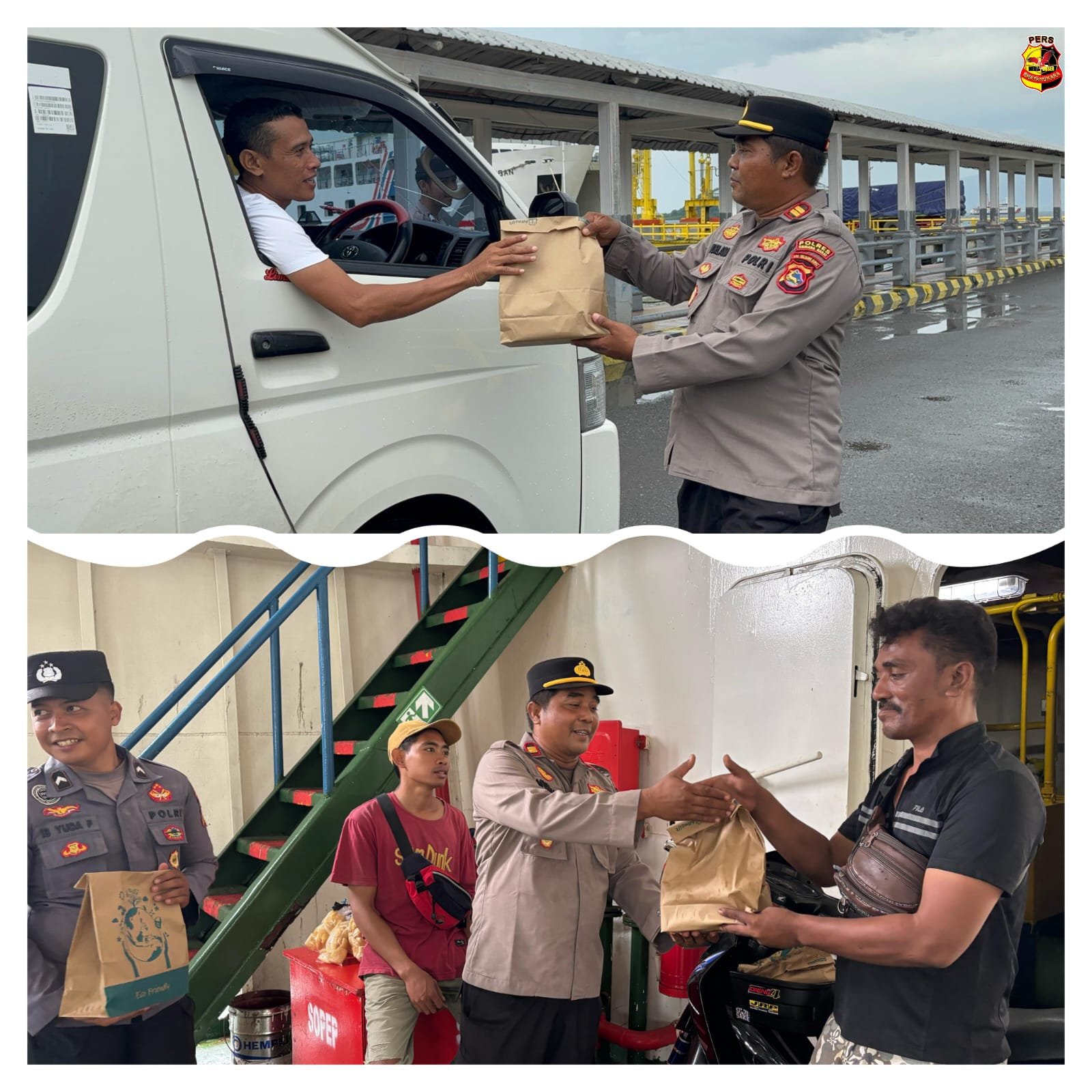 Kegiatan Bulan Suci Ramadhan, Personel Polsek KPL Tano Berbagi Berkah Paket Berbuka Puasa kepada Kru Kapal dan Pengguna Jasa Penyeberangan